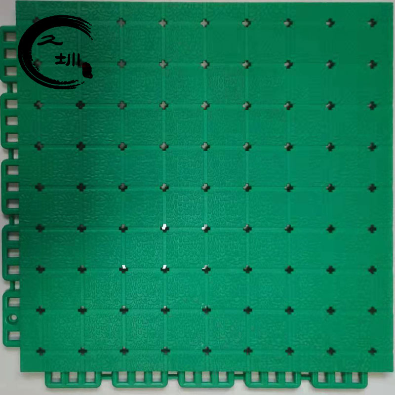 室外籃球場ESE熱塑懸浮地墊運動場TPU軟塑拼裝地板支撐采用米子口子十字支撐,可以使面層更平整,運動時不會使面層變形:“米字形”密集性柱腳有序支撐,形成穩(wěn)固的抗沖擊系統(tǒng),沖擊吸收優(yōu)異,表面采用蜂窩式防滑紋路處理。
